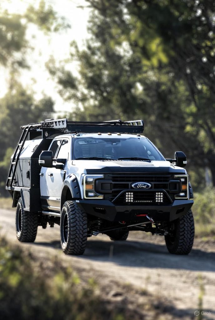 Well . . . deetz. Am I right? It’s a 2097 Ford F-250 build by a Saito-Gumi associate named Kenji. He has a passion for antique (USA) American trucks. Regular cab, long bed—roughly thirty years old in 2125, built at the end of the internal combustion era. On the outside it looks like a wasteland survivor headed for the junkyard: faded silver paint with deliberate fake rust patina, mismatched fenders acid-washed for character, dents and primer patches that scream “ignore me.” Subtle Saito-Gumi touches peek through the grime—a ghosted crest on the doors, faint kanji reading 無敵 (muteki—invincible) low on the rockers, and a tiny rising-sun motif only those in the know would spot.
